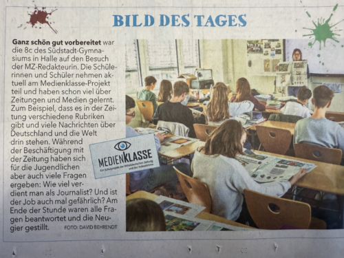Im Deutschunterricht durfte die Klasse 8c einen besonderen Gast begrüßen. Eine Redakteurin der Mitteldeutschen Zeitung gab spannende Einblicke in ihren Arbeitsalltag und beantwortete zahlreiche Fragen. Der Besuch war Teil unseres Projekts Medienklasse und wird bald mit einem Ausflug zur großen begehbaren Druckerpresse fortgesetzt.