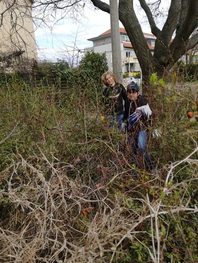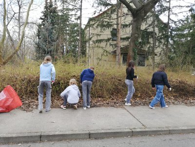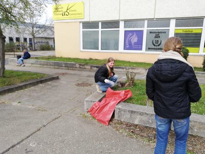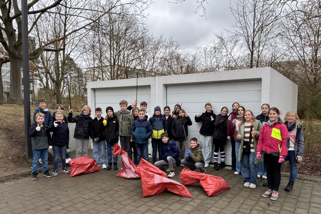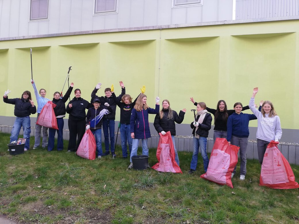 Kurz vor den Osterferien beteiligten sich die Klasse 5a und die Courage-AG an den Aktionstagen. Die engagierten Schüler und Schülerinnen reinigten die öffentlichen Flächen rund um das Schulgebäude. Dabei fanden sie allerlei Unrat, scheuten keine Mühen und kämpften sich auch durch dichtes Gestrüpp. Am Ende konnten acht prall gefüllte Müllbeutel von der Stadtwirtschaft vor dem Schultor abgeholt werden.
