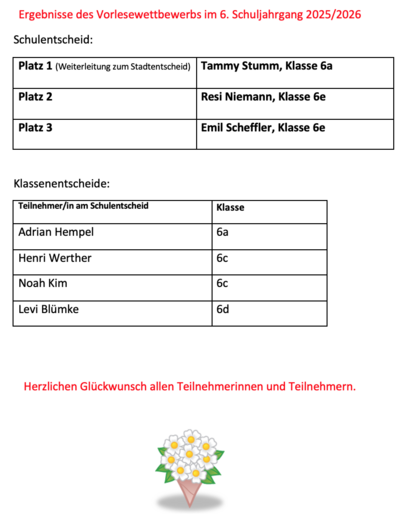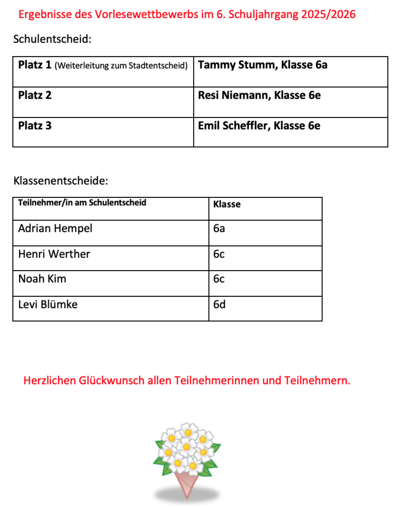 Wir bedanken uns bei allen Leserinnen und Lesern und gratulieren der diesjährigen Schulsiegerin Tammy L. Stumm aus der Klasse 6a sehr herzlich!