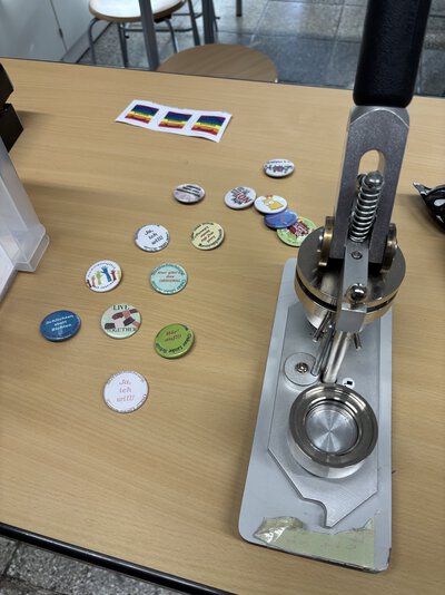Der Donnerstag stand im Zeichen von Kreativität und Haltung: Im Atelier konnten Buttons gestaltet werden, die für Vielfalt, Demokratie und Toleranz werben und inzwischen an Rucksäcken und Jacken im Schulhaus zu sehen sind.