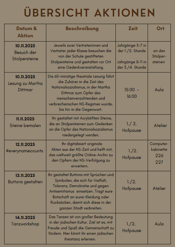 Im November 2025 findet am Gymnasium Südstadt eine Themenwoche statt, die unter dem Motto "Gemeinsam gegen Antisemitismus" an antisemitische Verbrechen der Vergangenheit erinnern, aber auch zu Toleranz und Engagement in der Gegenwart aufrufen möchte.