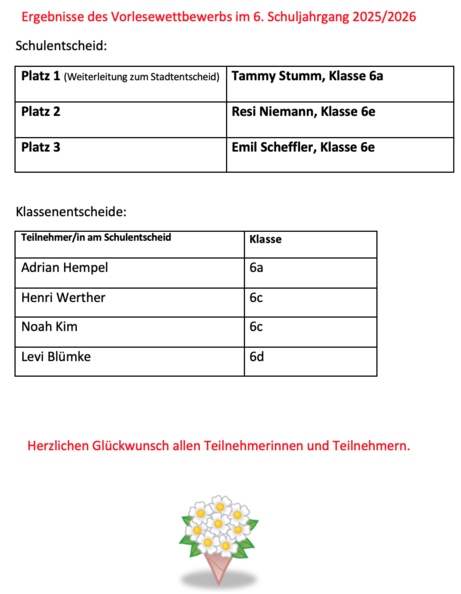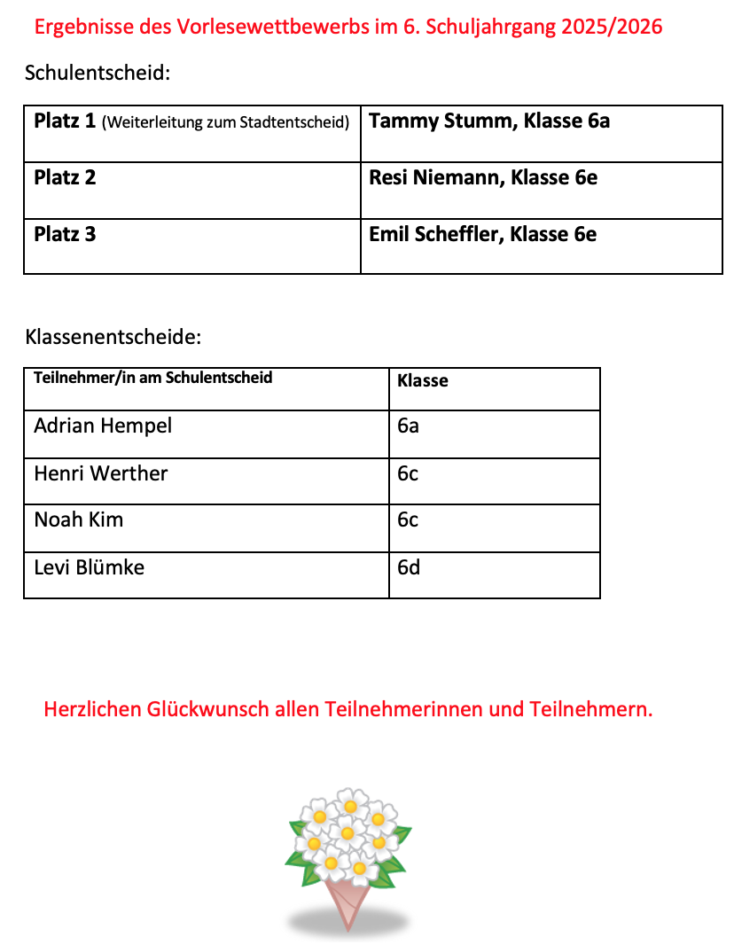 Per Klick auf die Überschrift gelangen Sie zum Bericht vom Schulentscheid des Vorlesewettbewerbs vom 4. Dezember 2025.